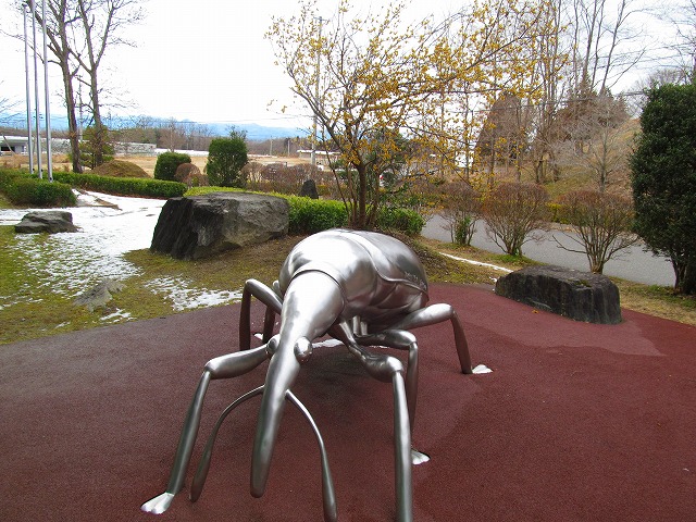 野外のステンレス昆虫のオブジェの脇に咲いています。